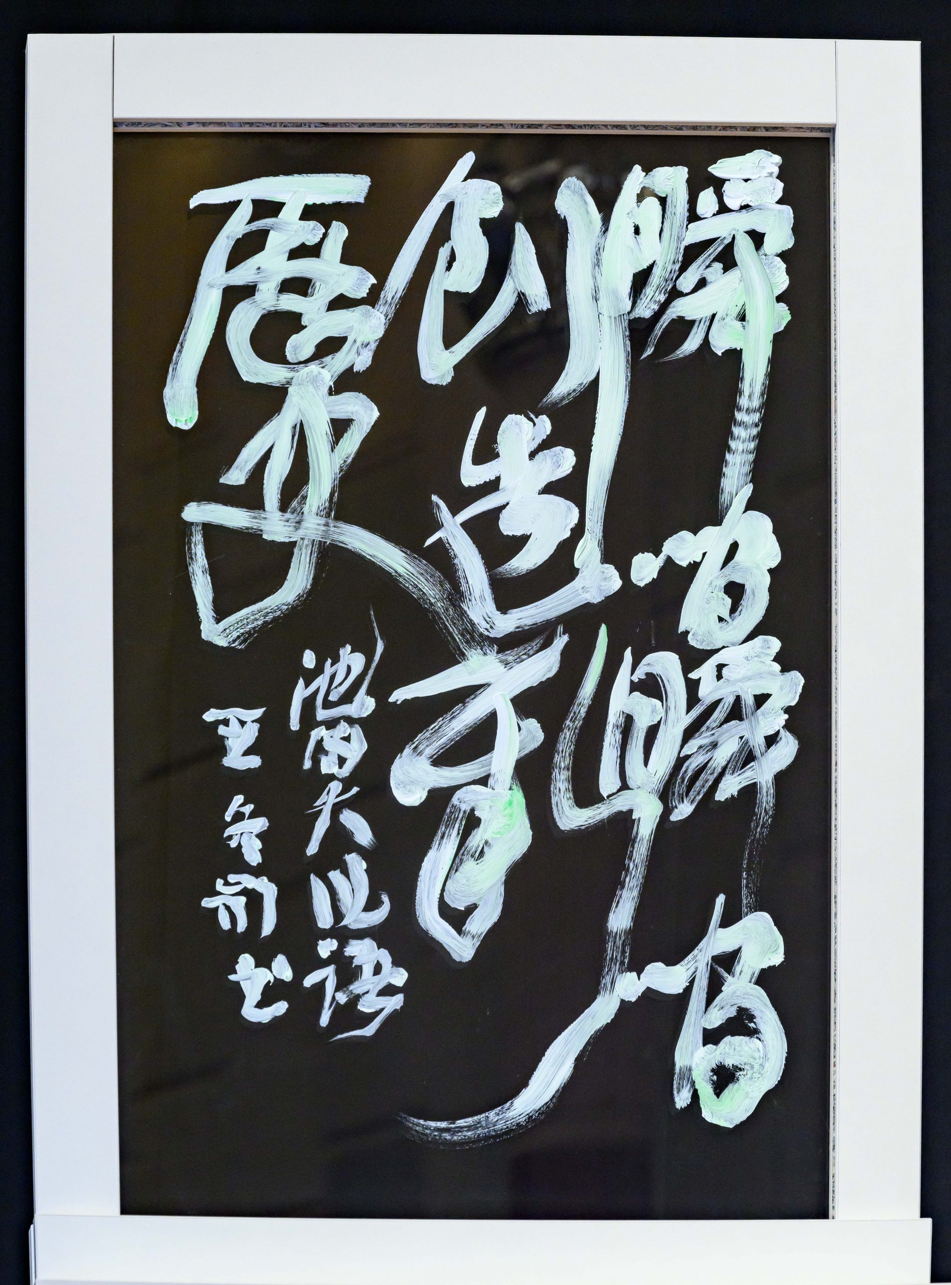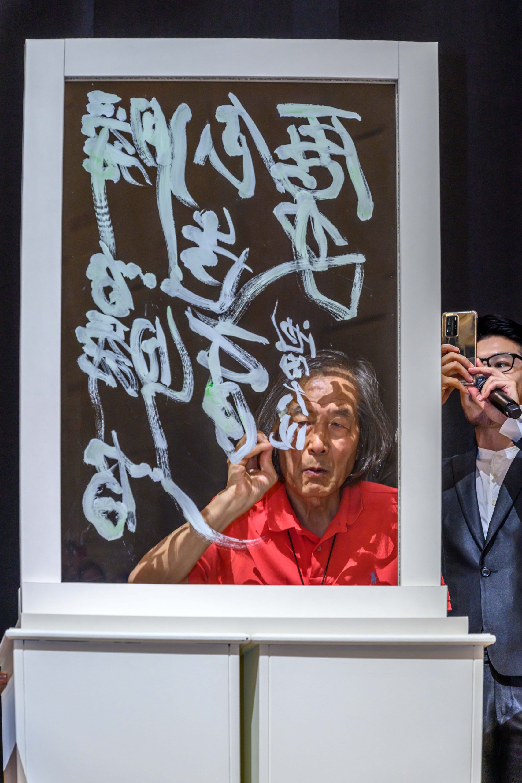 Wang Dongling on a live demonstration, inscribing President Ikeda’s quotation - “Create History from Moment to Moment” on an acrylic board with a blend of white and green acrylic paint.